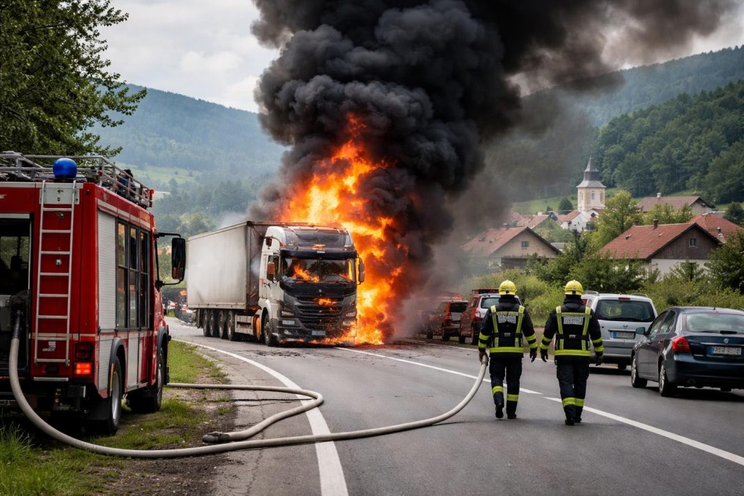 Drăganu: TIR în flăcări pe DN7, trafic blocat în zonă, pompierii intervin